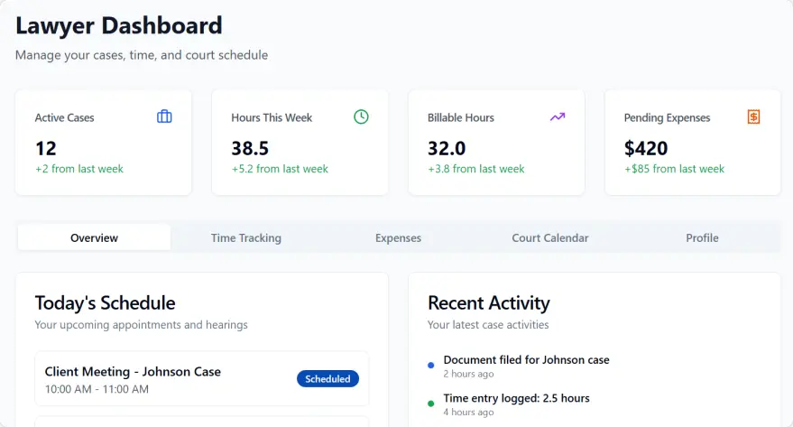 Work smarter, not harder. LawLanes combines case management, time tracking, expense control, and seamless payments into one intuitive platform—so you can focus on your clients, not admin work.